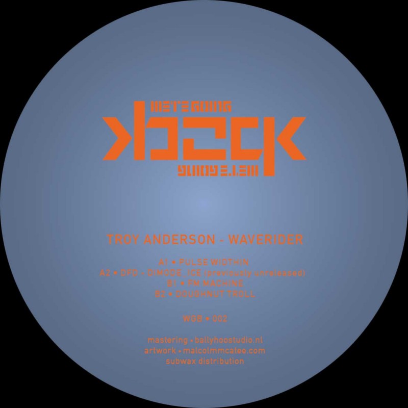Troy Anderson, also known as Waverider, DFD, and Cityboy, released a limited number of twelve-inch records through 1200 Music. Following on from the success of the Cityboy release, We're Going Back presents Troy Anderson's second EP under the alias Waverider. This release comprises of four tracks of immersive and deep techno. This release also features an unreleased track, Dimode_Ice.