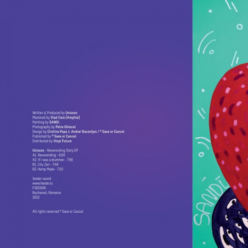 Romanian record label, feeder sound, proceeds with its fifth pressing in the catalogue, this time inviting local duo Unisson to showcase their latest productions. Titled “Neverending Story EP”, the material provides a robust minimal sound, carefully crafted with intricate breakbeat rhythms, introspective textures and electric effects that sweep through the frequencies with style. The artwork for the vinyl features SANDi’s painting created alongside the duo’s performance on one of feeder sound’s LIVE sessions, an event that also acted as the online vernissage for the Street Art București exhibition.