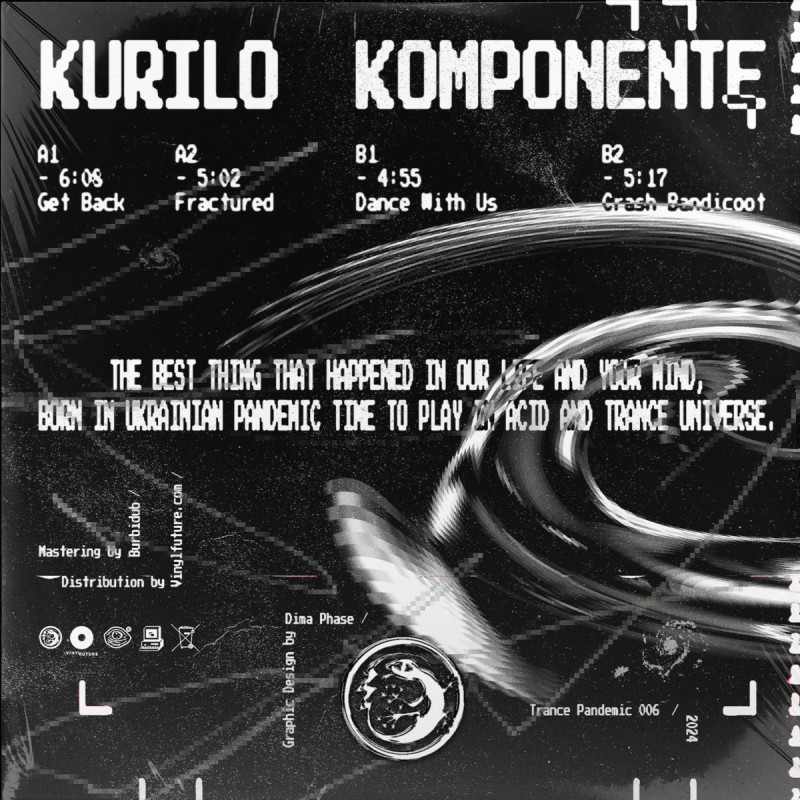 Ukrainian label Trance Pandemic continues to evolve, in this issue we have full black and white cover designed by Dima Phase. This EP is a split of goa trance-house from Kurilo and Roland's acids and drum machines from Komponente.