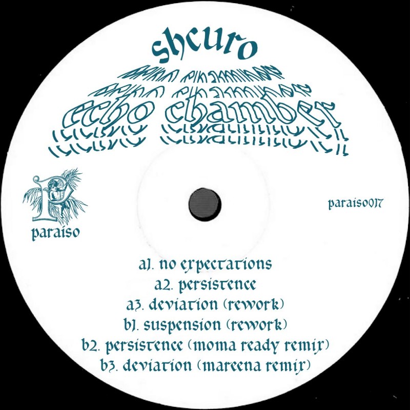 Fresh off producing a seminal documentary about the origin story of Portuguese rave culture, Shcuro returns to his mother tongue, music, to give us four slices of fresh yet classic Lisbon underground flavour right as the summer sets in. 'Echo Chamber' EP, Para?so's 17th outing, comes with two equally excellent remixes separated by the atlantic: Brooklyn's MoMA Ready and Berlin's Mareena. Side A starts with two tracks first blueprinted this past year as Shcuro prepared a new live set. 'No Expectations' opens the record with a high-paced sweat-breaker that elegantly evokes early rave culture as stabs, funk and feelings abound. A2 'Persistence' follows suit with the work that exudes proficiency: sound design, dub techno learnings and masterful layering all conspire to create a moment of pure techno draw. Closing side A, 'Deviation' pulls some of the previous track's energy even though it's a rework from the artist's earlier unreleased catalogue: another sign that we're talking realness here. Clever percussion and refreshing washes drive us well into dubby territories. 'Suspension' opens the B side, picking up where it left off with the last original: a beautifully produced piece with fleeting mutating stabs that seem to swim alongside us in an imaginary oceanic dancefloor. Liquid, refreshing sensorial motifs seem to underpin this record and that spirit spills into the remix pack, starting off with MoMA Ready's take on 'Persistence', bringing out the rawness in the original while adding a special sauce with Robert Hood-like funky yet minimalistic bleep work. Tresor's Mareena steps in for a centered, dancefloor-geared - but still mysterious - twist on 'Deviation', perfectly rounding up the record with the expertise of a club resident.