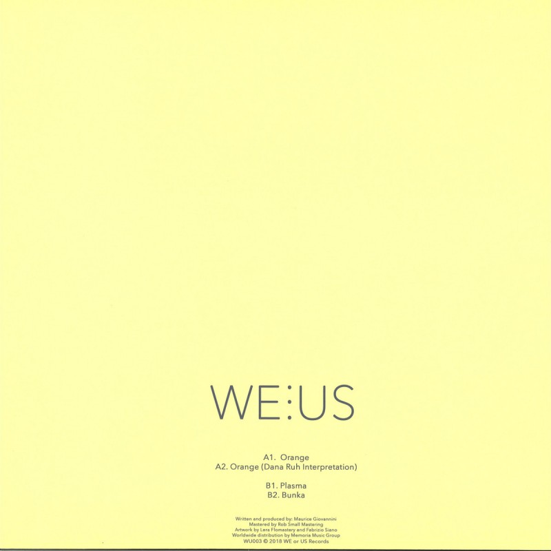 The third release of WEorUS comes with four massive tracks perfectly delivered by talented Maurice Giovannini and remixed by Cocoon's rising star Dana Ruh. The EP enter with 'Orange' a mystically track perfect matched with the label concept of timeless music. Dana Ruh on A2 gives the perfect energy for a fully crowded dance floor, maintaining the spiritual feeling in the background, just a perfect interpretation. 'Plasma' for Maurice is the tune that truly can make you go on a higher level, the structure, the sound design and feeling are deeply matched together for a nice and warm B1 start. 'Bunka' ends the EP in a perfect way giving you the need to reloop the entire EP. Maurice again hits with a perfect vinyl already supported by Ricardo Villalobos, Rhadoo and many others.
