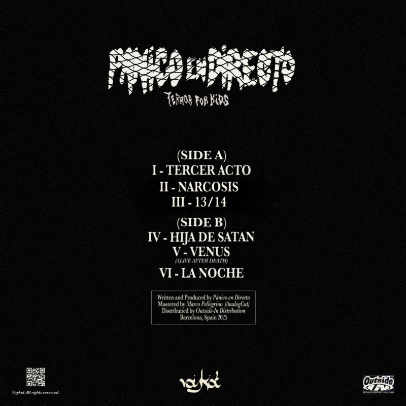 Voykot closes the trilogy with PANICO EN DIRECTO unleashing its darkest chapter: Terror for kids. The definitive third act where terrifying melodies and aggressive soundscapes come with no parental advisory. Sounds mutated into pure shadows, an uncompromising immersion into electronic darkness that completes the cycle of a perfect nightmare.